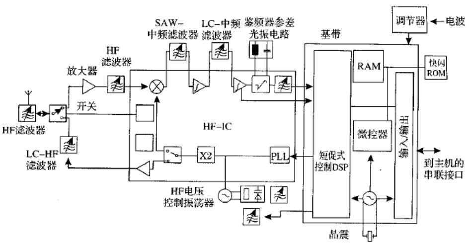 圖1藍牙無線電系統(最少兩個芯片)的典型方案右邊為基帶處理器,左邊為高頻模塊,附加濾波器和天線開關元件
