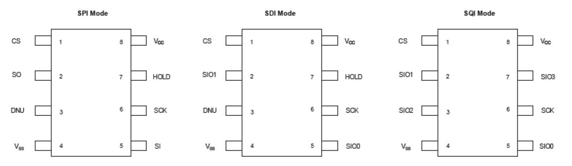 與兼容的主設備一起使用時,該設備還支持SDI(串行雙接口)和SQI(串行四接口)操作模式。要進入SDI模式,必須輸入ESDI命令(3Bh)。按照SDI操作模式的慣例,每個時鐘使用SIO0和SIO1引腳輸入兩位。位首先以MSB時鐘輸入。要進入SQI模式,必須輸入ESQI命令(38h)。對于SQI操作模式,每個時鐘輸入4位數據,或者每個時鐘輸入1個半字節(jié)。半字節(jié)首先由MSB提供時鐘。
