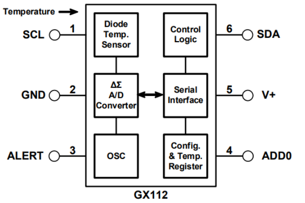 數字溫度傳感器,GX112是一款高精度、低功耗、可替代NTC/PTC熱敏電阻的數字溫度傳感器,可用于通信、計算機、消費類電子、環境、工業和儀器儀表應用中的溫度測量。正常工作范圍在-40℃至+125℃內,可提供≤±0.5℃的溫度精度,并具有良好的溫度線性度。
