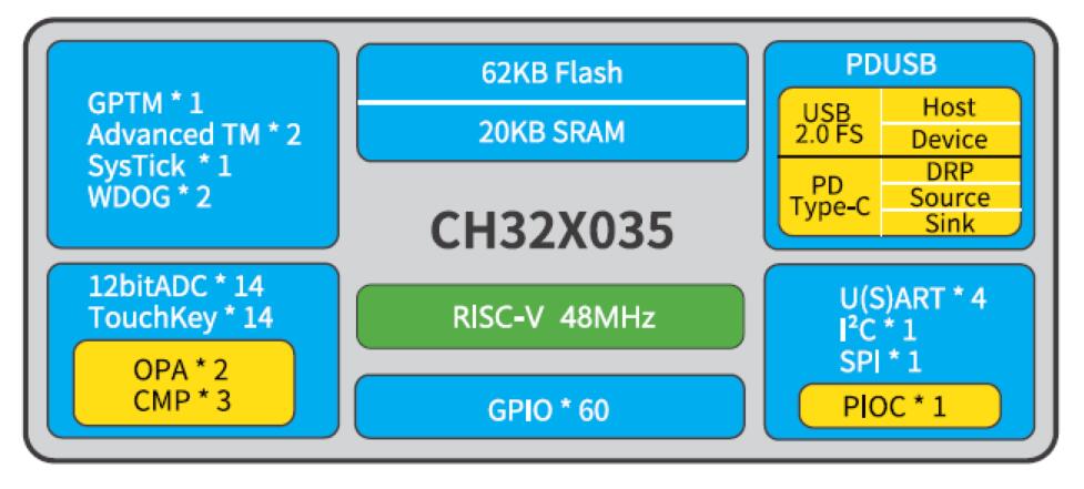 CH32X035系列是基于青稞V4C內(nèi)核設(shè)計(jì)的工業(yè)級微控制器。內(nèi)置USB和PD PHY,支持USB Host主機(jī)和USBDevice設(shè)備功能、PDUSB及Type-C快充功能,內(nèi)置可編程協(xié)議I/O控制器,提供OPA運(yùn)放、CMP電壓比較器、USART串口、/2C、SPI、定時器、12位ADC、Touchkey等豐富外設(shè)資源。