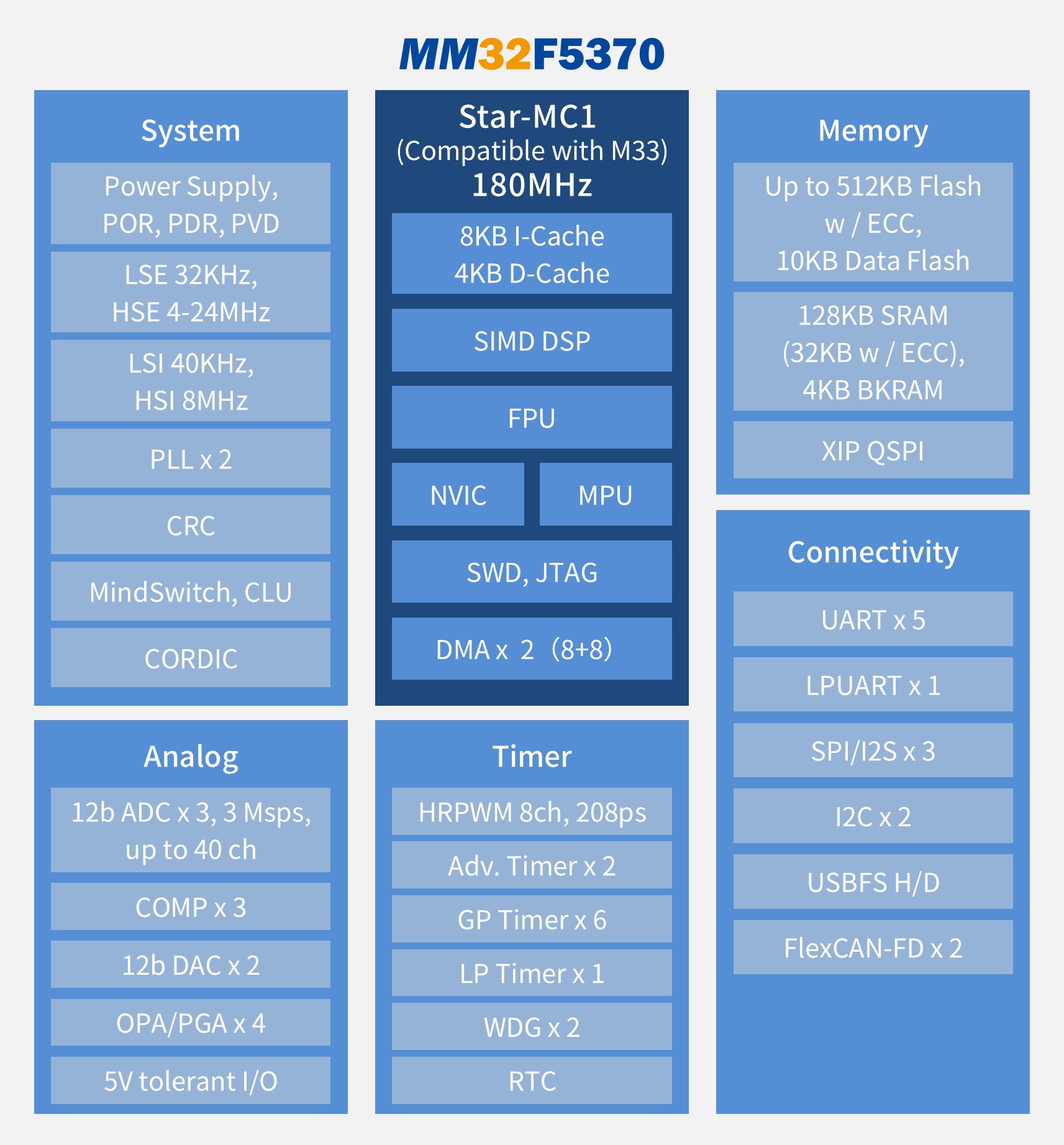 MM32F5370搭載國產Star-MC1內核,基于Armv8-M架構,指令集兼容Cortex-M33,提供高達512KB flash,支持ECC,并提供分區讀保護,支持代碼二次開發,保護方案商利益;另有10KB Data Flash,獨立分區。提供高達128KB SRAM,其中32KB支持ECC;另有4KB retentionRAM,可在Standby模式下對數據進行保持。提供QSPI外部存儲擴展接口,并支持XIP。該型號滿足三電機應用的實時控制需求。
