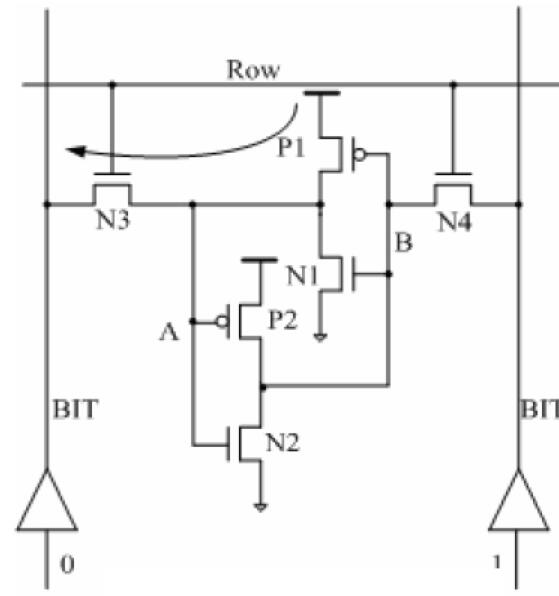 在六管單元的寫(xiě)操作中,外部電路驅(qū)動(dòng)兩個(gè)互補(bǔ)的信號(hào)到位線BIT 和BIT_上,字線驅(qū)動(dòng)器驅(qū)動(dòng)字線ROW 到高電平,位線信號(hào)經(jīng)兩個(gè)傳輸管寫(xiě)入存儲(chǔ)節(jié)點(diǎn)。如圖3.6 所示的正是向存有“1”的單元寫(xiě)“0”的情況,也就是把A 點(diǎn)的電平由VDD 下拉至GND。