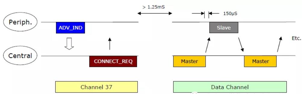 低功耗藍(lán)牙芯片特有的設(shè)計(jì),也是其快速建立連接的基礎(chǔ)。低功耗藍(lán)牙設(shè)備之間建立連接的過(guò)程如下: