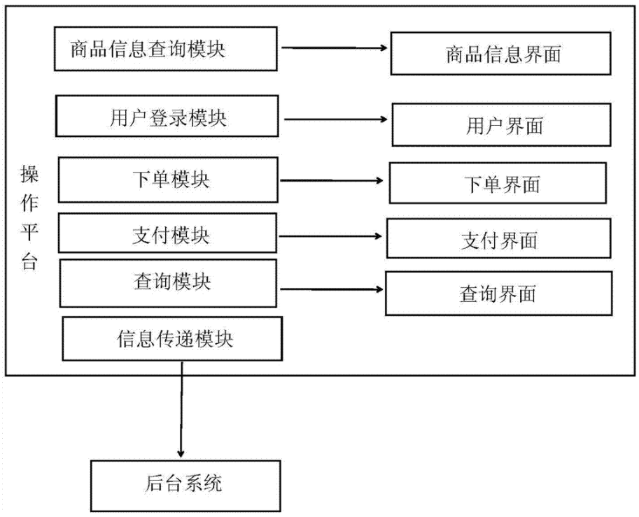 基于實(shí)物展示的共享網(wǎng)絡(luò)銷售柜,該銷售柜柜設(shè)有多個展示臺和操作電腦;展示臺用以擺放展示商品,展示柜分為多層多格,用以存放不同的物品;操作電腦連通公共網(wǎng)絡(luò),具有主機(jī)和操作平臺;操作平臺上設(shè)有商品信息查詢模塊,用戶登錄模塊,下單模塊,支付模塊,查詢模塊和信息傳遞模塊;買家通過展示臺選中商品后,在操作平臺上登錄商品信息查詢模塊,通過該商品信息查詢模塊的商品信息界面了解商品信息,通過用戶登錄模塊的用戶界面登錄,通過下單模塊的下單界面購買商品,通過支付模塊的支付界面完成付款和打印發(fā)票,通過查詢模塊的查詢界面查詢購買信息;信息傳遞模塊將用戶購買信息通過網(wǎng)絡(luò)發(fā)送給商家;商家接收到購買信息后,通過物流將產(chǎn)品發(fā)送給買家。