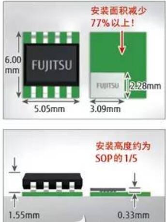 FRAM——MB85RS1MT,這是一款有8引腳晶圓級芯片尺寸封裝(WL-CSP)的產(chǎn)品,與傳統(tǒng)業(yè)界標準SOP封裝相比,此款WL-CSP大約為SOP的23%,能夠減少約77%的安裝面積。而且本W(wǎng)L-CSP的厚度為0.33mm,約是信用卡的一半,從安裝體積比來看,能夠減少大約95%的體積。 是