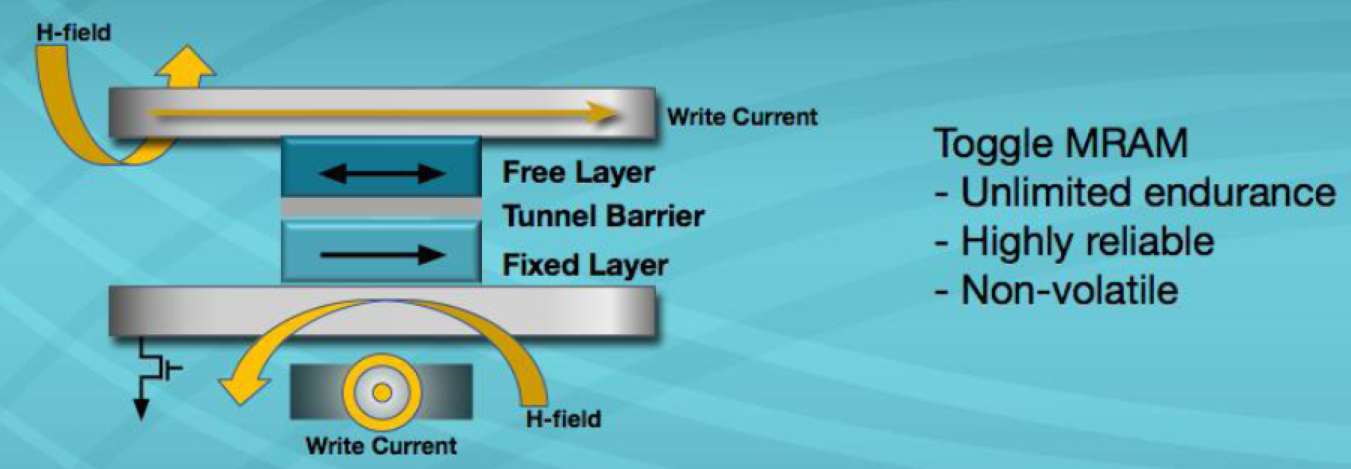 MRAM或磁性隨機存取存儲器使用具有鐵磁性材料的磁性“狀態(tài)”的1晶體管–1磁性隧道結(1T-1MTJ)體系結構作為數(shù)據(jù)存儲元素。由于MRAM使用磁性狀態(tài)進行存儲(而不是隨時間推移而“泄漏”的電荷),因此MRAM提供了相當長的數(shù)據(jù)保留時間(+20年)和無限的耐用性。切換磁極化(寫入周期)是在電磁隧道結(MTJ)上方和下方的導線中產(chǎn)生脈沖電流的結果(見圖1)。電流脈沖產(chǎn)生的相關H場改變了鐵磁材料自由層的極化,這種磁開關不需要原子或電子的位移,這意味著沒有與MRAM相關的磨損機制。自由層相對于固定層的磁矩改變了MTJ的阻抗(見圖2)。阻抗的這種變化表示數(shù)據(jù)的狀態(tài)(“1”或“0”)。通過測量MTJ的阻抗來實現(xiàn)傳感(讀取周期)(圖3)。MRAM器件中的讀取周期是非破壞性的,并且相對較快(35ns)。讀取操作是通過在MTJ兩端施加非常低的電壓來完成的,從而在部件壽命內支持無限的操作。