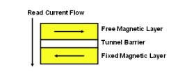 存儲(chǔ)位的置“0”狀態(tài)或置“1”狀態(tài)正是由自由層的極性來(lái)確定的。自由層極性和固定層極性一致時(shí)(指向相同方向),穿越MTJ棧層的阻抗很低(請(qǐng)參閱圖1)。自由層極性和固定層極性180度相反時(shí)(指向相反方向),穿越MTJ棧層的阻抗就很高(請(qǐng)參閱圖2)。由MTJ堆棧中的低阻抗和高阻抗來(lái)確定是否將位元讀為“0”或“1”。