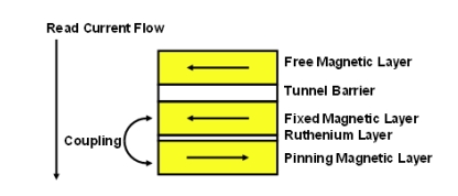 飛思卡爾半導(dǎo)體還通過(guò)增加兩個(gè)附加層來(lái)改進(jìn)固定磁性層。在固定層下面增加了一層釕(Ru)。而在Ru層下面又增加了另一層稱(chēng)為牽制層(pinning layer)的磁性層。固定層和牽制層的極性相反,將會(huì)引起很強(qiáng)的耦合。該強(qiáng)耦合使固定層的極性保持鎖定,因此不會(huì)在編程操作過(guò)程中引起誤反轉(zhuǎn)(圖4)。